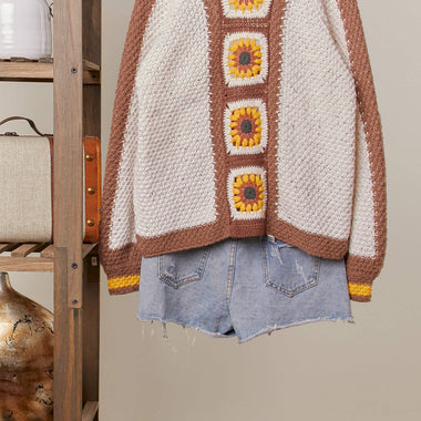 Color Block Sunflower Crochet V Neck Cardigan