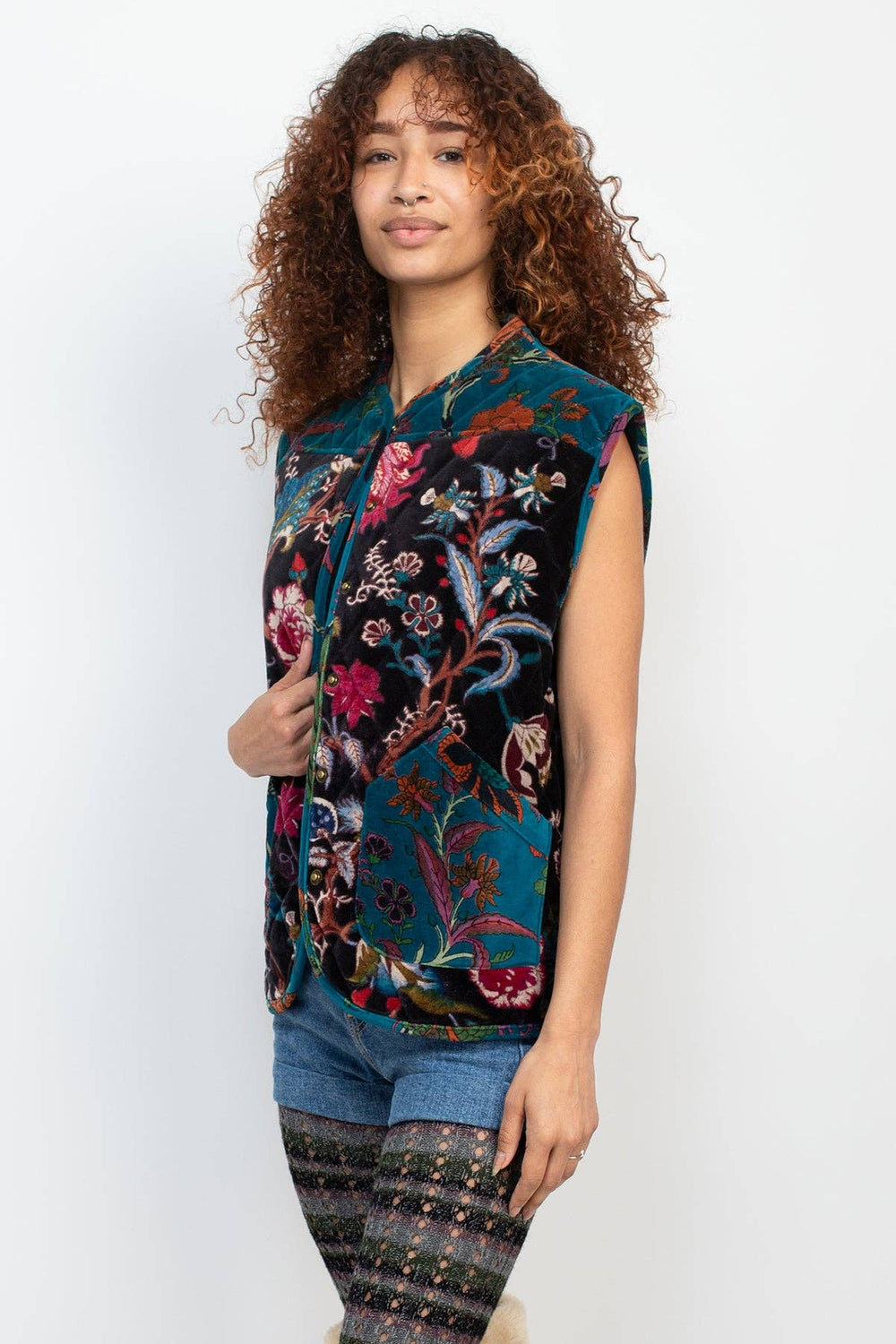 Elevate your layers with our Quilted Velvet Snap Vest, a luxe-meets-boho essential for every season. Crafted from 100% cotton velvet, this vest brings a soft, sophisticated touch to your favorite tops and tees. The quilted design adds cozy texture, while the floral and block print with intricate paisley detailing gives it that one-of-a-kind Elevated Hippie flair.