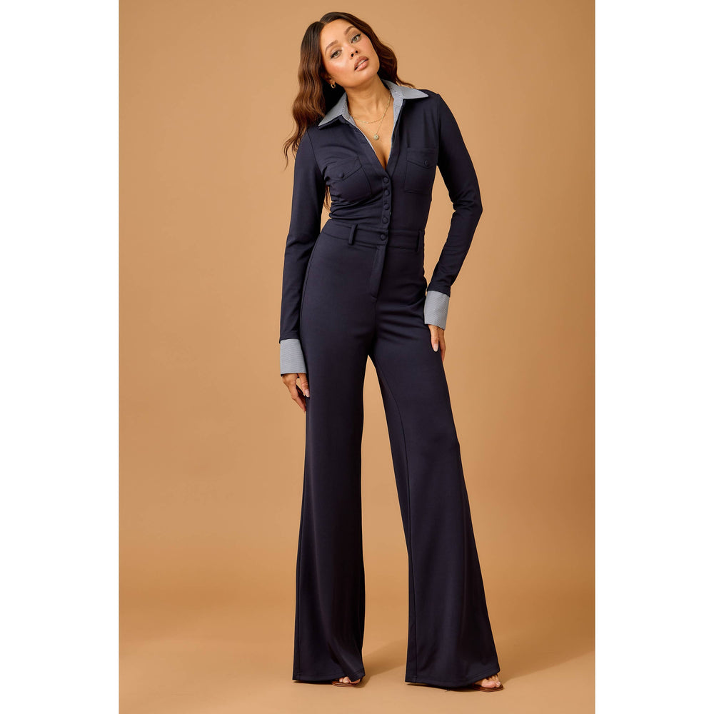 Own the season in this polished navy stretch jumpsuit, where timeless tailoring meets modern attitude. Designed with a contrast collar and cuffs, long sleeves, and a streamlined wide-leg silhouette, it's the ultimate power look for cooler weather. From desk to dinner, this piece delivers chic confidence and fall-ready sophistication.