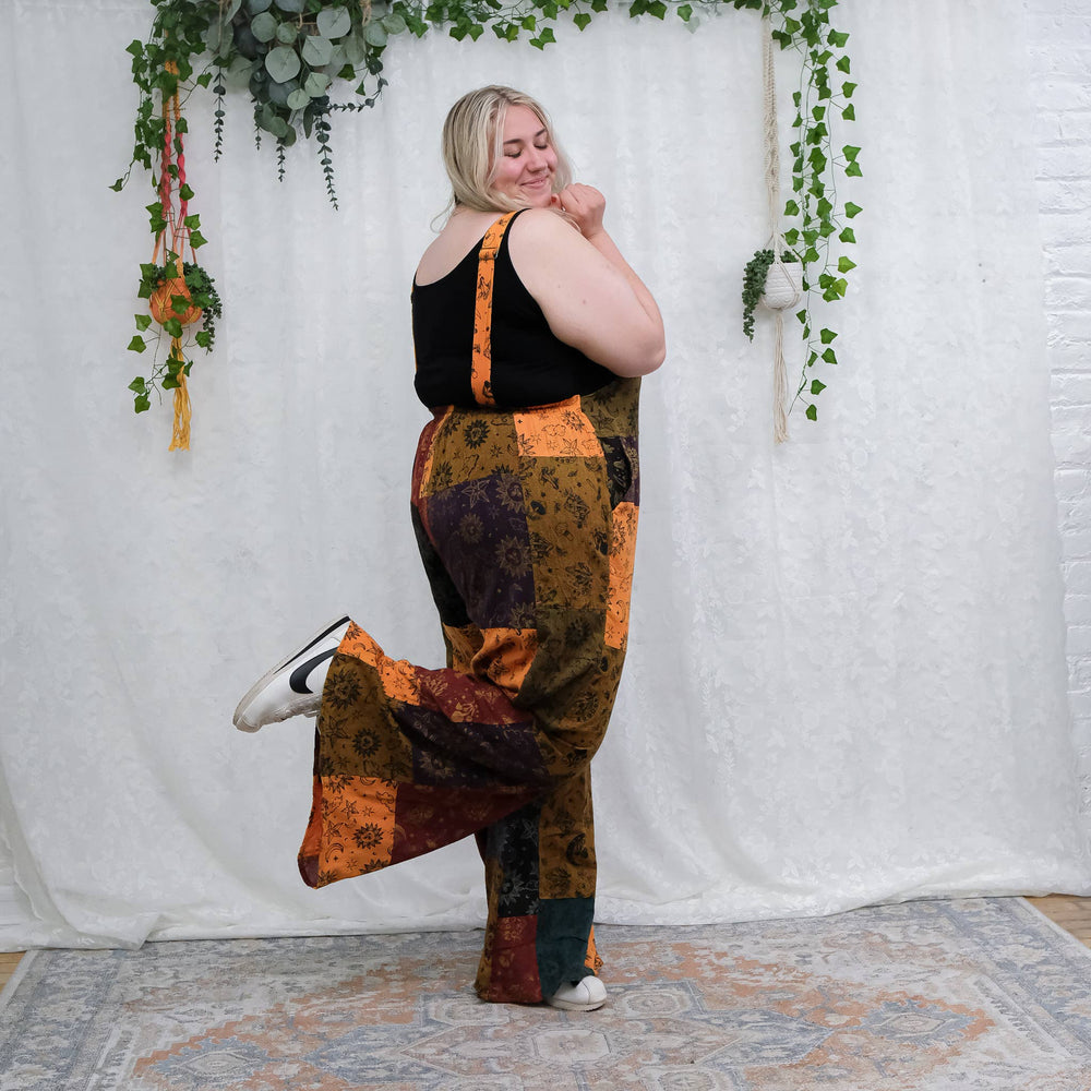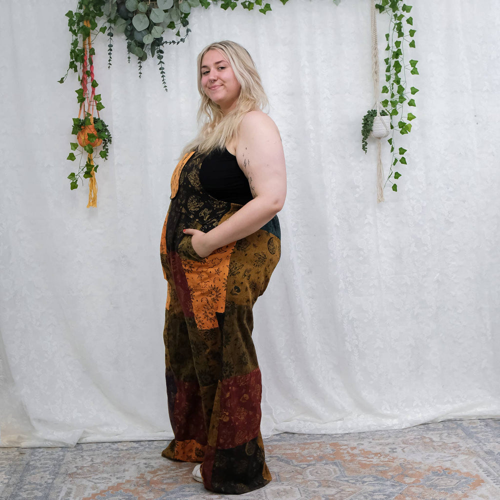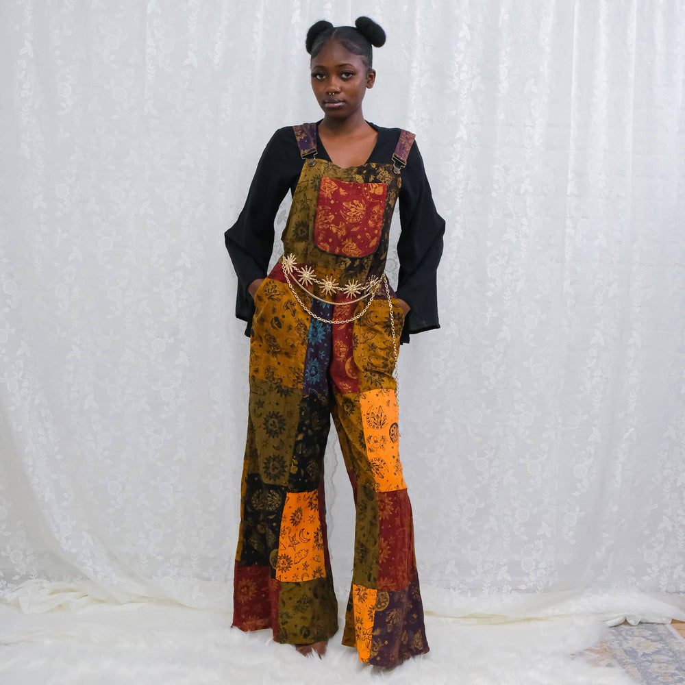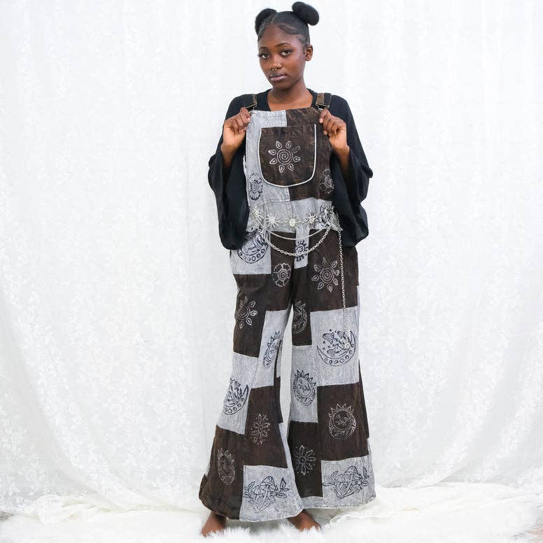 Expertly crafted by hand, this Patchwork Gothic Bib Wide Leg Jumpsuit is a must-have for fashion-forward individuals. With its unique bell bottom and gothic style, featuring mesmerizing mushroom, celestial, snake, and skull block prints, this all-season jumpsuit is perfect for making a bold statement. Keep your essentials close with the two convenient side pockets. Handmade in Nepal Material: Cotton ** This Bell Bottom Jumpsuit has a bib pocket on the front along with two side pockets. ** The Straps are adjustable as it has a suspender design ** The back of this jumpsuit has elastic which allows you to have more stretch and fits the way your body is. ONE SIZE MEASUREMENTS Length from top of bib: 51" Total Length from top of Strap: Approx. 62" (The Straps are adjustable) Waist: Approx. 24" to 41" Hip: Fits up to Approx. 46" Inseam: Approx. 29 inches