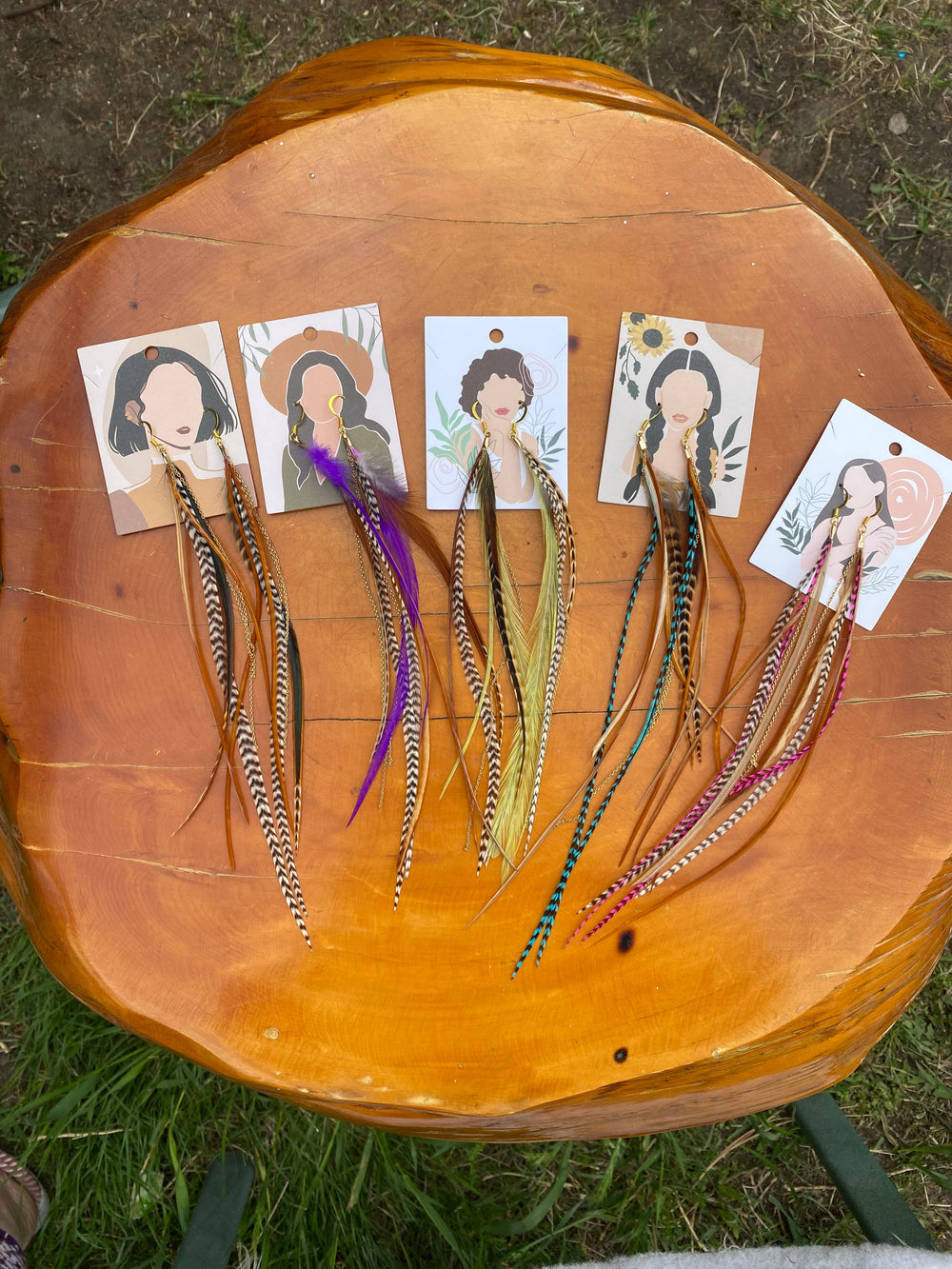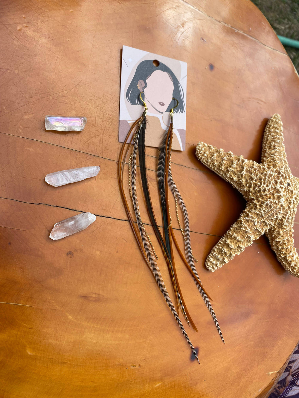 This best seller listing is for 5 beautiful pair of handmade feather earrings. This pair has beautiful natural rooster Feathers with a mix of color accent feathers to add Bohemian elegance to any style. Length is between 7-8 inches. You will also find brass accents, and always lead and nickel free!