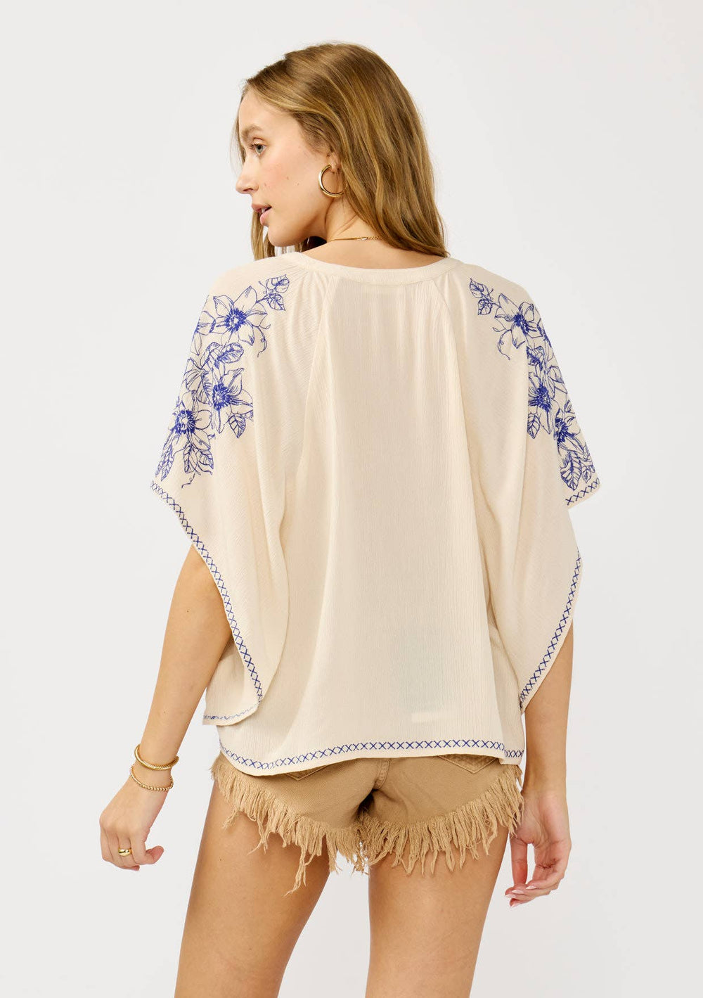 Breathe in summer with this effortlessly breezy crinkle gauze V-neck top, kissed with floral embroidery and boho soul. Delicate "X" stitching dances along the raglan seams and hemline, while the floral threads bloom along the front and sleeve outseams for just the right touch of hippie charm.