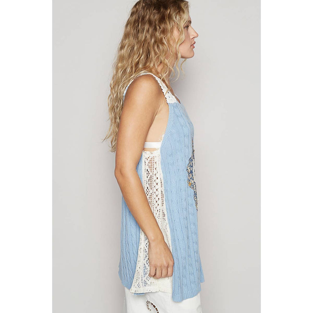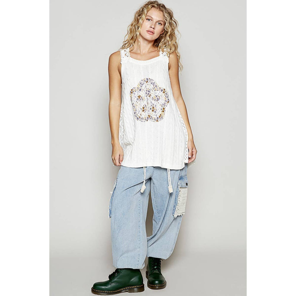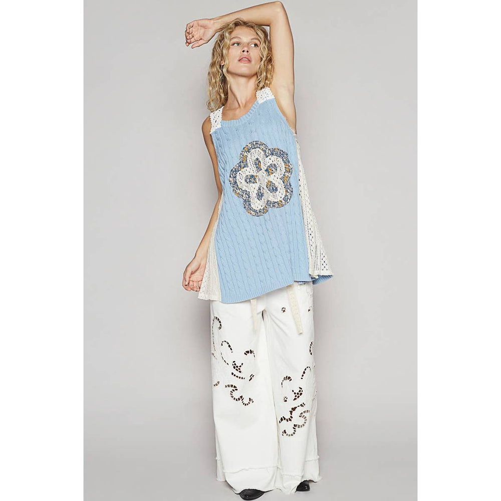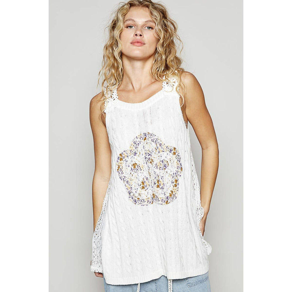 A grounded beauty with a touch of whimsy. This sleeveless cotton sweater top features a classic round neck, delicate lace patching, and sweet floral accents that bloom with personality. Finished with ribbed trim and thoughtful strap detail, it's a soft, structured staple that wears well all year long.