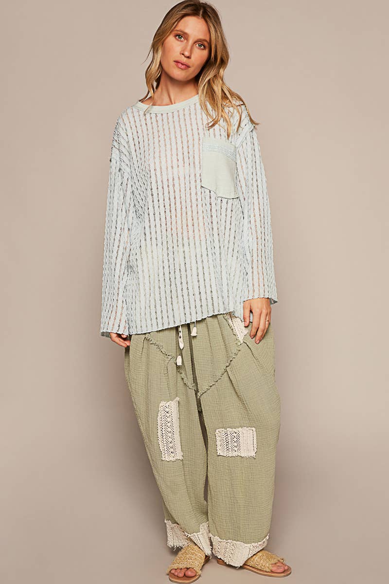 Your everyday essential just got a laid-back upgrade. The Round Neck Long Sleeve Cut & Sew Knit Top is an easygoing staple with subtle charm — designed with a relaxed fit, cozy round neckline, and a front pocket for that effortlessly lived-in feel.