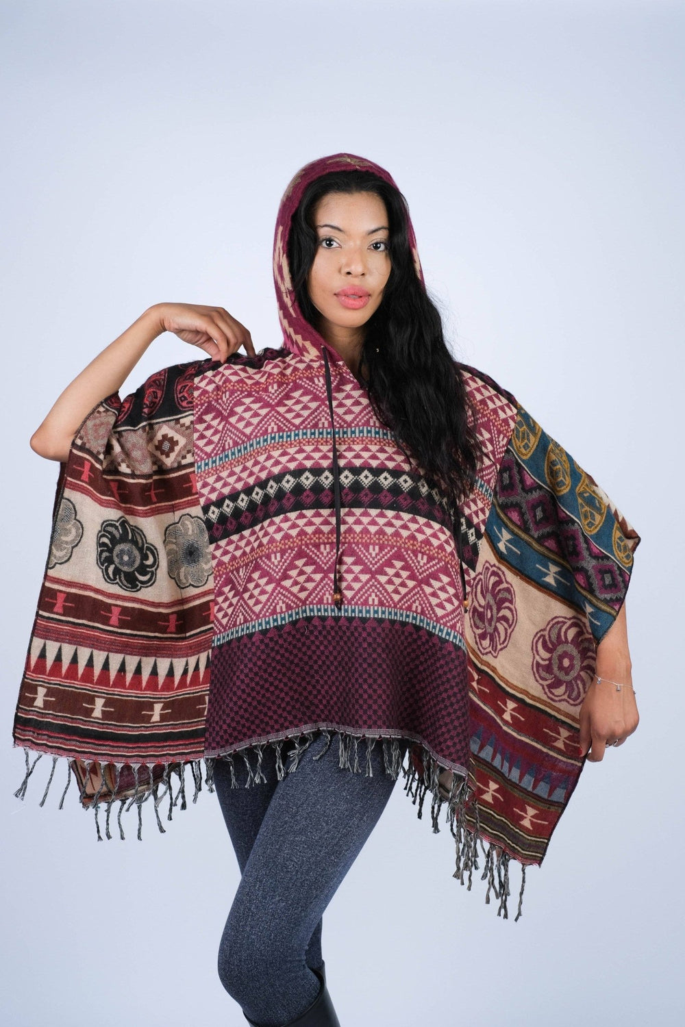 Wrap yourself in warmth and vibrant charm with our Sacred Threads Boho Chic Patchwork Poncho, a perfect blend of comfort and bohemian flair. Crafted from soft acrylic fabric, this poncho features an eclectic mix of geometric and floral patterns in rich, earthy hues of maroon, beige, and teal. The fringe detailing along the hem adds a playful, free-spirited touch, while the loose, flowing fit ensures comfort and effortless movement. Designed with a practical hood and a front zipper closure, this poncho is as versatile as it is stylish, making it the perfect layering piece for cooler days. 🌸🍂