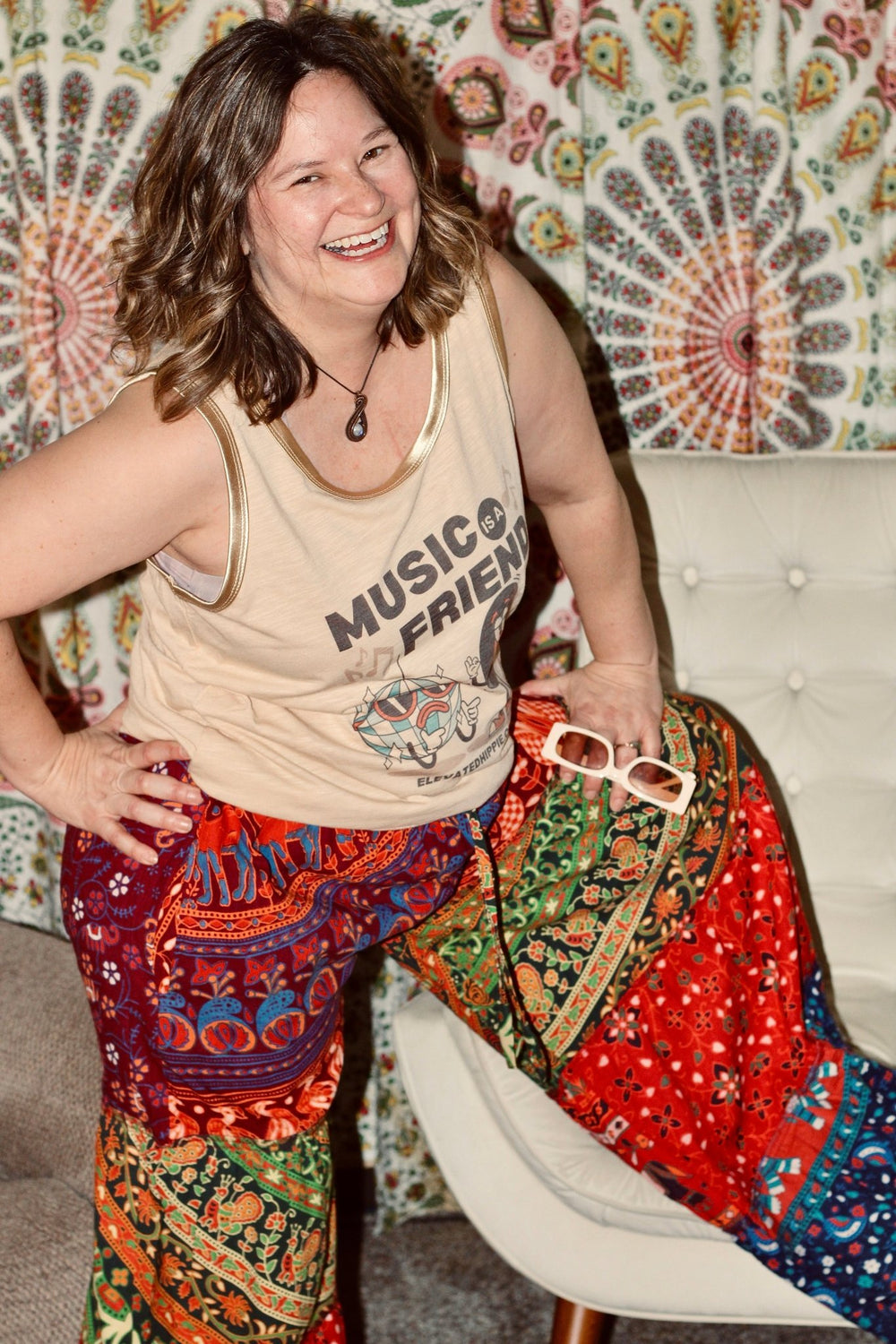 Let your soul roam free in the Caravan Dreams Pants—a layered patchwork masterpiece for the modern-day nomad. These wide leg pants feature a mix of vibrant, handcrafted fabric panels, creating a one-of-a-kind look that celebrates color, culture, and creativity.