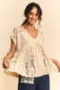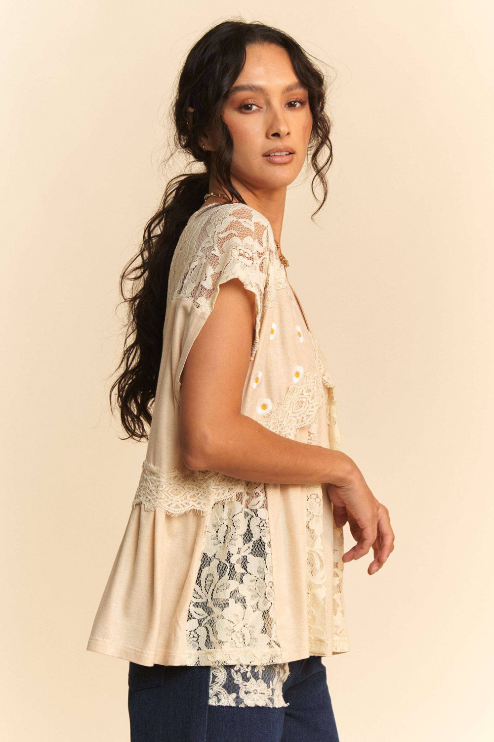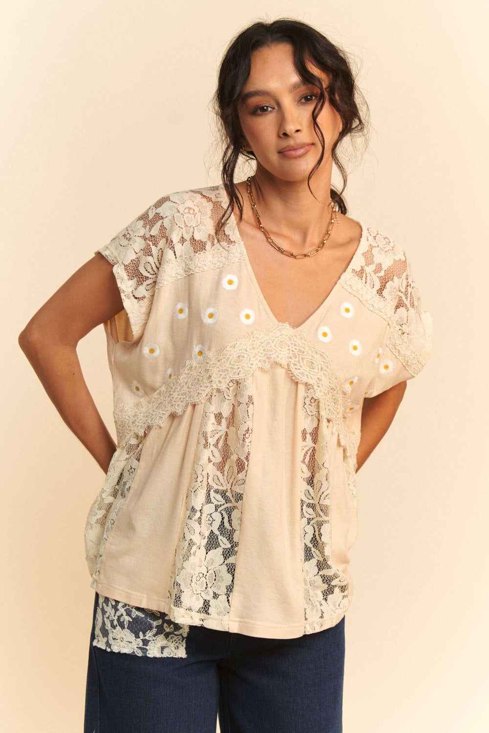EMBROIDERY DAISY FLOWY DOLMAN KNIT TOP WITH LACE