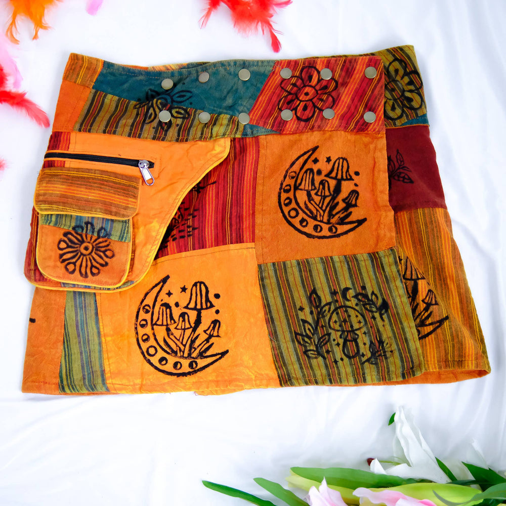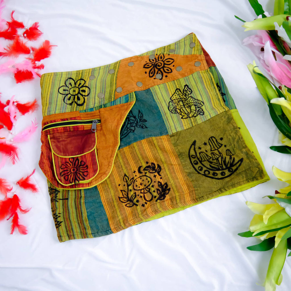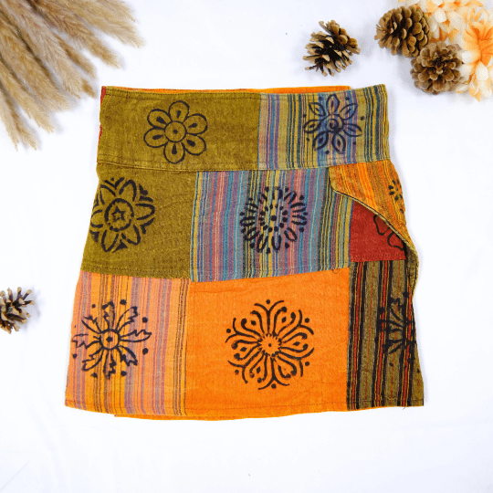 Add a pop of playful patchwork to your boho wardrobe with this handmade cotton wrap skirt, ethically crafted in Nepal using organic cotton. Designed with a double row of popper buttons, this beauty gives you adjustable sizing that hugs you just right at the mid-waist—plus, it’s got a side zip + velcro pocket for your essentials on-the-go.