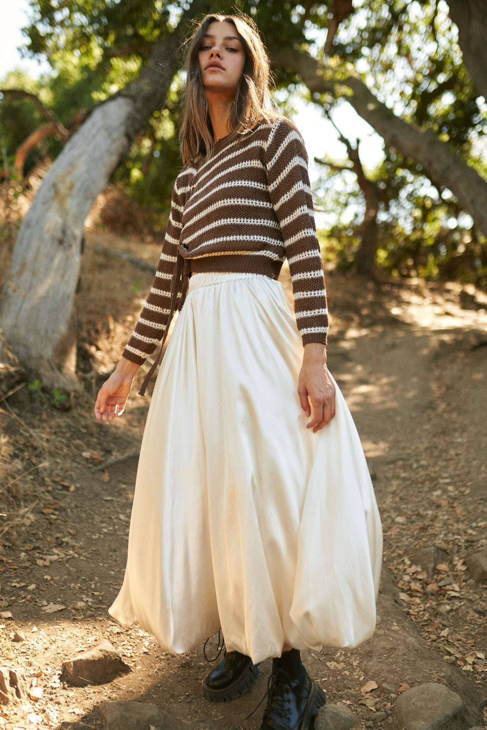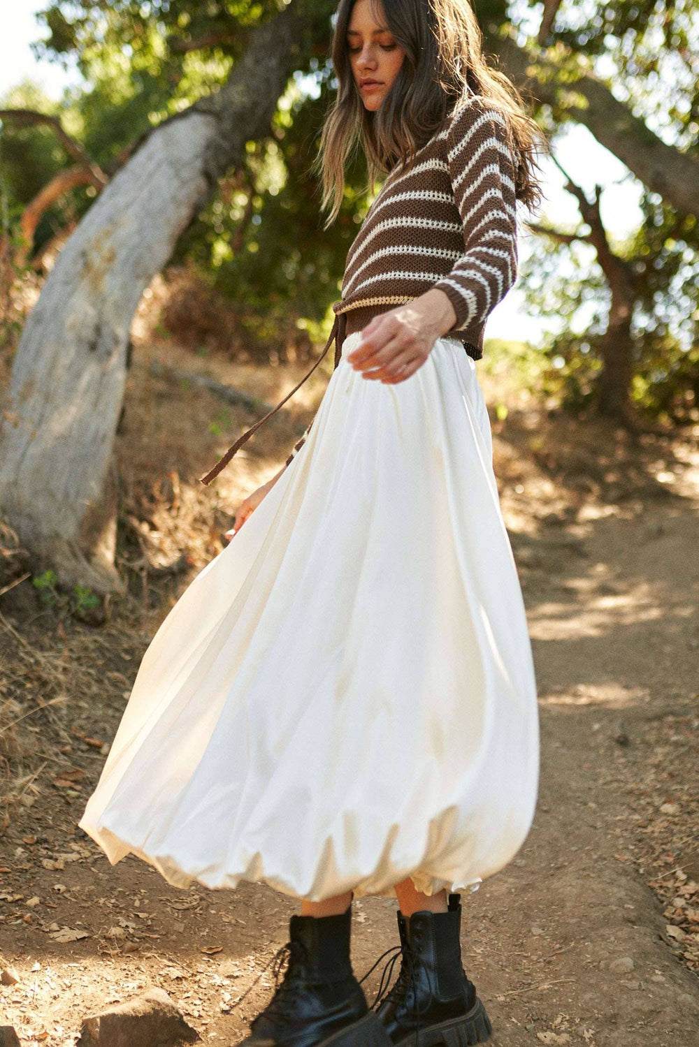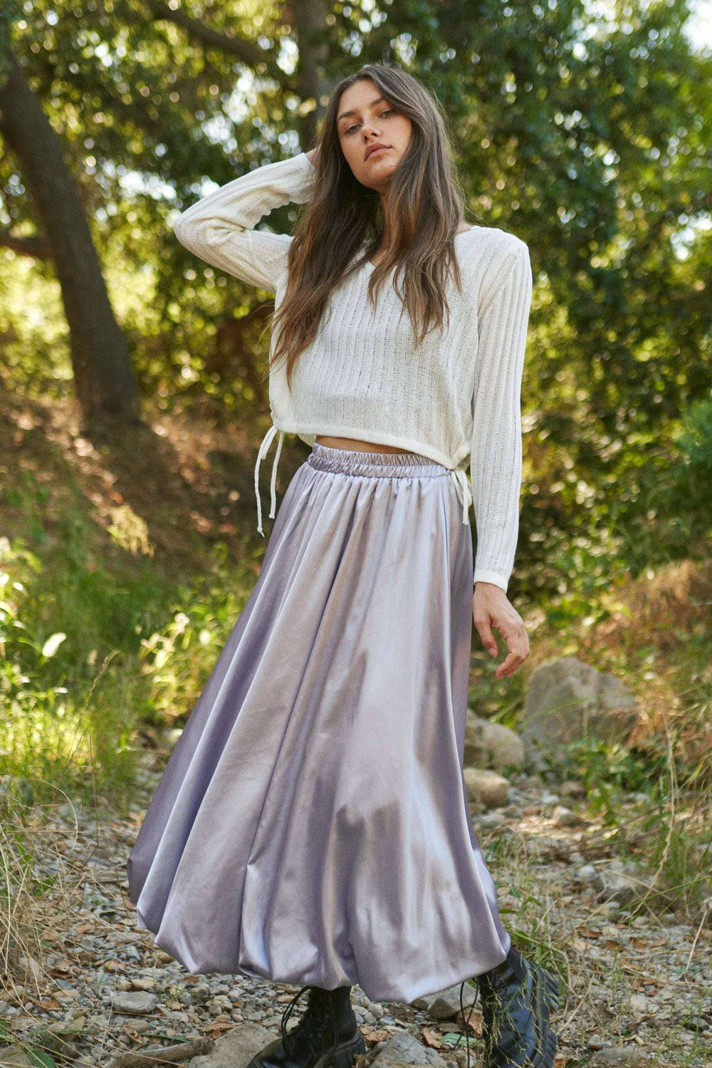 Float through your day in this silky, high-shine satin skirt featuring a comfy elastic waistband and playful bubble flare hem. Soft, stylish, and effortlessly chic — it’s the perfect piece to dress up or keep it casual. ✨